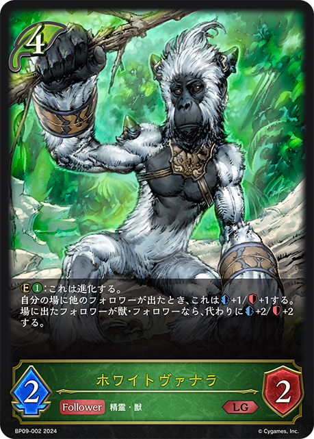 ホワイトヴァナラ クラス エルフ カード種類 フォロワー タイプ 精霊・獣 レアリティ LG 収録商品 ブースターパック第9弾「光影の二重奏」 コスト4攻撃力2体力2 :これは進化する。自分の場に他のフォロワーが出たとき、これは+1/+1する。場に出たフォロワーが獣・フォロワーなら、代わりに+2/+2する。 獅子猿BP09-002