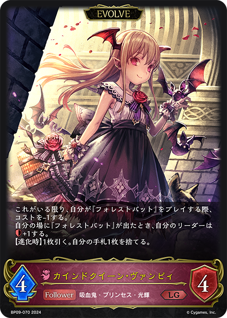 カインドクイーン・ヴァンピィ クラス ナイトメア カード種類 フォロワー・エボルヴ タイプ 吸血鬼・プリンセス・光輝 レアリティ LG 収録商品 ブースターパック第9弾「光影の二重奏」 コスト-攻撃力4体力4 これがいる限り、自分が『フォレストバット』をプレイする際、コストを-1する。自分の場に『フォレストバット』が出たとき、自分のリーダーは+1する。【進化時】1枚引く。自分の手札1枚を捨てる。 まよこBP09-070 ブラッドクイーン・ヴァンピィ クラス ナイトメア カード種類 フォロワー・エボルヴ タイプ...