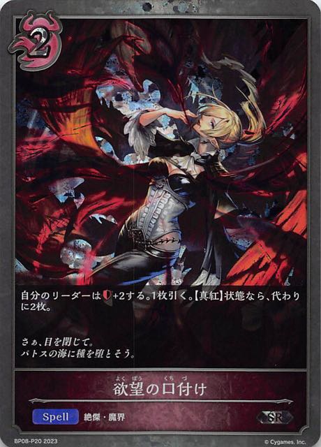 欲望の口付け クラス ナイトメア カード種類 スペル タイプ 絶傑・魔界 レアリティ SR・プレミアム 収録商品 ブースターパック第8弾「次元混沌」 コスト2攻撃力-体力- 自分のリーダーは+2する。1枚引く。【真紅】状態なら、代わりに2枚。 さぁ、目を閉じて。パトスの海に種を堕とそう。 虹原BP08-P20