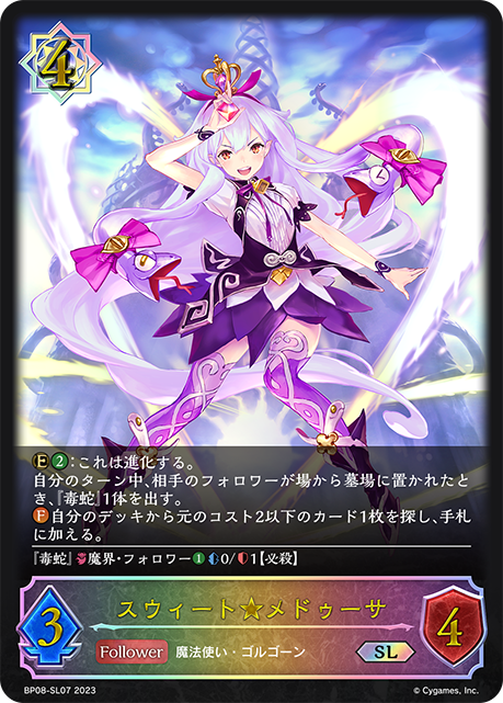 スウィート★メドゥーサ クラス ウィッチ カード種類 フォロワー タイプ 魔法使い・ゴルゴーン レアリティ SL 収録商品 ブースターパック第8弾「次元混沌」 コスト4攻撃力3体力4 :これは進化する。自分のターン中、相手のフォロワーが場から墓場に置かれたとき、『毒蛇』1体を出す。自分のデッキから元のコスト2以下のカード1枚を探し、手札に加える。―――――――――――――――『毒蛇』魔界・フォロワー0/1【必殺】 久方綜司BP08-SL07