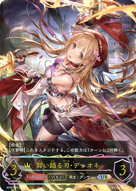 舞い踊る刃・ディオネ クラス ロイヤル カード種類 フォロワー・エボルヴ タイプ 兵士・ダンサー レアリティ UR 収録商品 ブースターパック第8弾「次元混沌」 コスト-攻撃力3体力3 【疾走】【攻撃時】これをスタンドする。この能力は1ターンに2回働く。 liikoBP08-U02