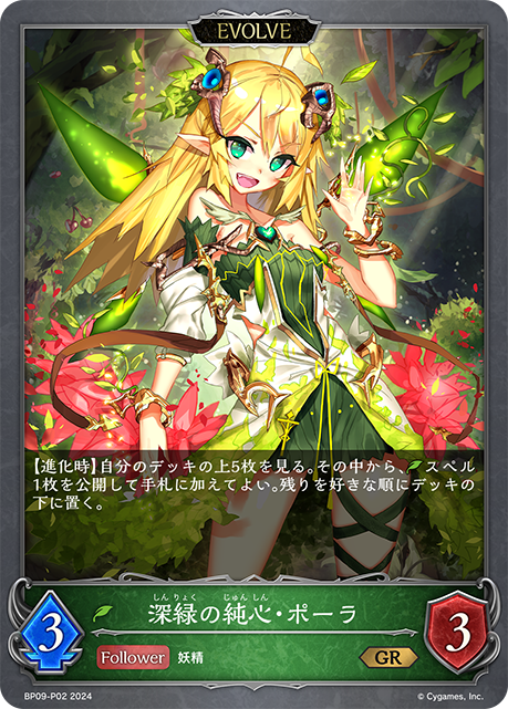 深緑の純心・ポーラ クラス エルフ カード種類 フォロワー・エボルヴ タイプ 妖精 レアリティ GR・プレミアム 収録商品 ブースターパック第9弾「光影の二重奏」 コスト-攻撃力3体力3 【進化時】自分のデッキの上5枚を見る。その中から、スペル1枚を公開して手札に加えてよい。残りを好きな順にデッキの下に置く。 BP09-P02 真紅の絆・ポーラ クラス エルフ カード種類 フォロワー・エボルヴ タイプ...