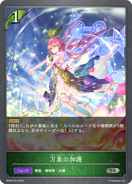 万象の加護 クラス エルフ カード種類 スペル タイプ 精霊・植物族・光輝 レアリティ SR・プレミアム 収録商品 ブースターパック第9弾「光影の二重奏」 コスト1攻撃力-体力- 1枚引く。自分の墓場にあるスペルのカード名の種類数が5種類以上なら、自分のリーダーは+2する。 久方綜司BP09-P04