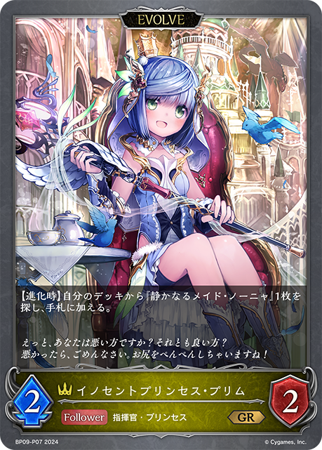 イノセントプリンセス・プリム クラス ロイヤル カード種類 フォロワー タイプ 指揮官・プリンセス レアリティ GR・プレミアム 収録商品 ブースターパック第9弾「光影の二重奏」 コスト2攻撃力1体力1 :これは進化する。『ナイト』1体を出す。―――――――――――――――『ナイト』兵士・フォロワー1/1 えなれいんBP09-P06