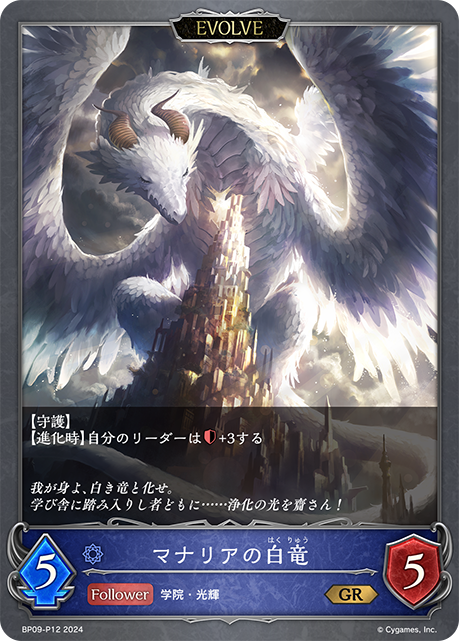 マナリアの竜術士 クラス ウィッチ カード種類 フォロワー タイプ 学院 レアリティ GR・プレミアム 収録商品 ブースターパック第9弾「光影の二重奏」 コスト2攻撃力2体力2 :これは『マナリアの白竜』か『マナリアの黒竜』に進化する。この能力は自分の墓場の学院・カードが5枚以上なら使える。自分の手札の学院・カード1枚を捨ててよい。捨てたなら、1枚引く。捨てなかったなら、これを墓場に置く。 Justice WongBP09-P11