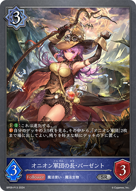 オニオン軍団の長・バーゼント クラス ウィッチ カード種類 フォロワー タイプ 魔法使い・魔法生物 レアリティ SR・プレミアム 収録商品 ブースターパック第9弾「光影の二重奏」 コスト3攻撃力3体力3 :これは進化する。自分のデッキの上5枚を見る。その中から、『オニオン軍団』2枚まで場に出してよい。残りを好きな順にデッキの下に置く。 liikoBP09-P13