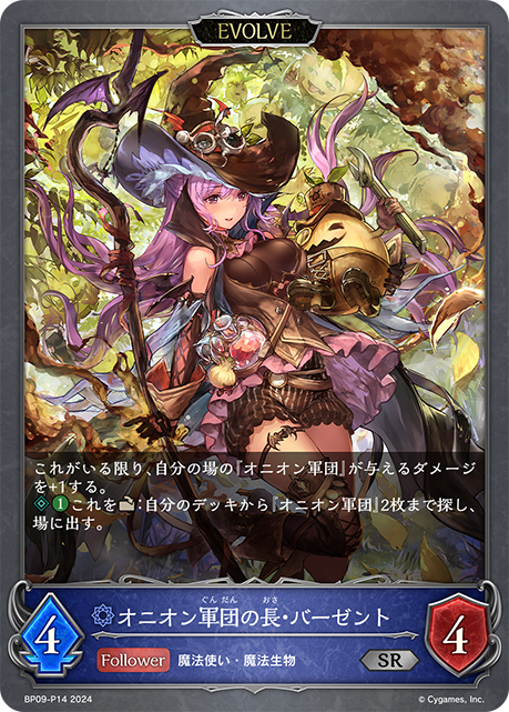 オニオン軍団の長・バーゼント クラス ウィッチ カード種類 フォロワー・エボルヴ タイプ 魔法使い・魔法生物 レアリティ SR・プレミアム 収録商品 ブースターパック第9弾「光影の二重奏」 コスト-攻撃力4体力4 これがいる限り、自分の場の『オニオン軍団』が与えるダメージを+1する。これを:自分のデッキから『オニオン軍団』2枚まで探し、場に出す。 liikoBP09-P14