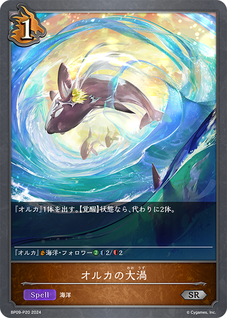 オルカの大渦 クラス ドラゴン カード種類 スペル タイプ 海洋 レアリティ SR・プレミアム 収録商品 ブースターパック第9弾「光影の二重奏」 コスト1攻撃力-体力- 『オルカ』1体を出す。【覚醒】状態なら、代わりに2体。―――――――――――――――『オルカ』海洋・フォロワー2/2 おにねこBP09-P20