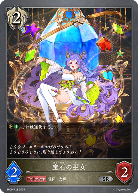 宝石の巫女 クラス ビショップ カード種類 フォロワー タイプ 信仰・光輝 レアリティ SR・プレミアム 収録商品 ブースターパック第9弾「光影の二重奏」 コスト2攻撃力2体力2 :これは進化する。 どんなジュエリーがお好みですの?よりどりみどりに、取り揃えてますわっ! ユウヒBP09-P28