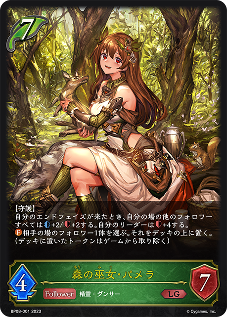 森の巫女・パメラ クラス エルフ カード種類 フォロワー タイプ 精霊・ダンサー レアリティ LG 収録商品 ブースターパック第8弾「次元混沌」 コスト7攻撃力4体力7 【守護】自分のエンドフェイズが来たとき、自分の場の他のフォロワーすべては+2/+2する。自分のリーダーは+4する。相手の場のフォロワー1体を選ぶ。それをデッキの上に置く。(デッキに置いたトークンはゲームから取り除く) LM7BP08-001