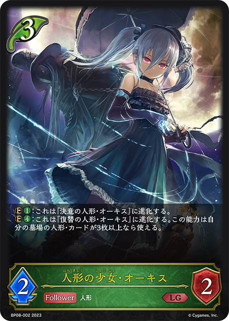 人形の少女・オーキス クラス エルフ カード種類 フォロワー タイプ 人形 レアリティ LG 収録商品 ブースターパック第8弾「次元混沌」 コスト3攻撃力2体力2 :これは『決意の人形・オーキス』に進化する。:これは『復讐の人形・オーキス』に進化する。この能力は自分の墓場の人形・カードが3枚以上なら使える。 ぽんずBP08-002