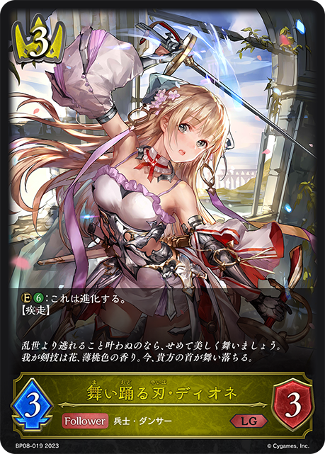 舞い踊る刃・ディオネ クラス ロイヤル カード種類 フォロワー タイプ 兵士・ダンサー レアリティ LG 収録商品 ブースターパック第8弾「次元混沌」 コスト3攻撃力3体力3 :これは進化する。【疾走】 乱世より逃れること叶わぬのなら、せめて美しく舞いましょう。我が剣技は花、薄桃色の香り。今、貴方の首が舞い落ちる。 liikoBP08-019