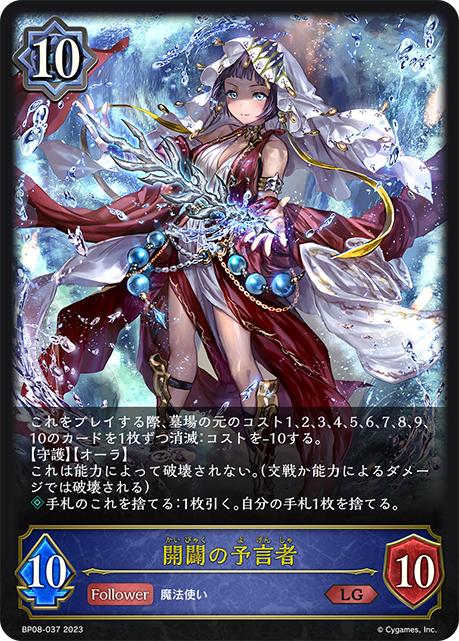 開闢の予言者 クラス ウィッチ カード種類 フォロワー タイプ 魔法使い レアリティ LG 収録商品 ブースターパック第8弾「次元混沌」 コスト10攻撃力10体力10 これをプレイする際、墓場の元のコスト1、2、3、4、5、6、7、8、9、10のカードを1枚ずつ消滅:コストを-10する。【守護】【オーラ】これは能力によって破壊されない。(交戦か能力によるダメージでは破壊される)手札のこれを捨てる:1枚引く。自分の手札1枚を捨てる。 iruaBP08-037