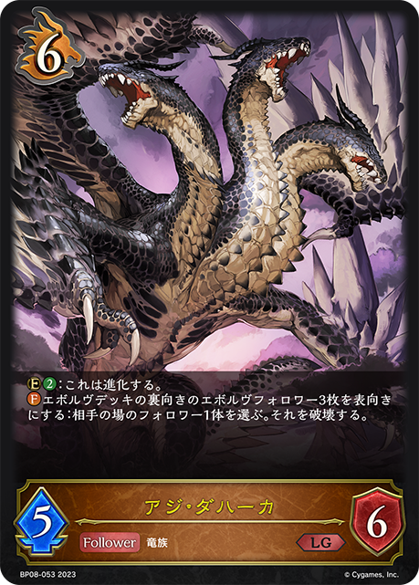 アジ・ダハーカ クラス ドラゴン カード種類 フォロワー タイプ 竜族 レアリティ LG 収録商品 ブースターパック第8弾「次元混沌」 コスト6攻撃力5体力6 :これは進化する。エボルヴデッキの裏向きのエボルヴフォロワー3枚を表向きにする:相手の場のフォロワー1体を選ぶ。それを破壊する。 タカヤマトシアキBP08-053