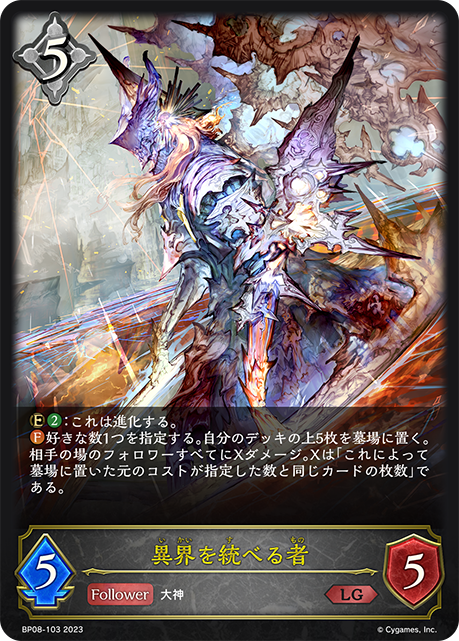 異界を統べる者 クラス ニュートラル カード種類 フォロワー タイプ 大神 レアリティ LG 収録商品 ブースターパック第8弾「次元混沌」 コスト5攻撃力5体力5 :これは進化する。好きな数1つを指定する。自分のデッキの上5枚を墓場に置く。相手の場のフォロワーすべてにXダメージ。Xは「これによって墓場に置いた元のコストが指定した数と同じカードの枚数」である。 BP08-103