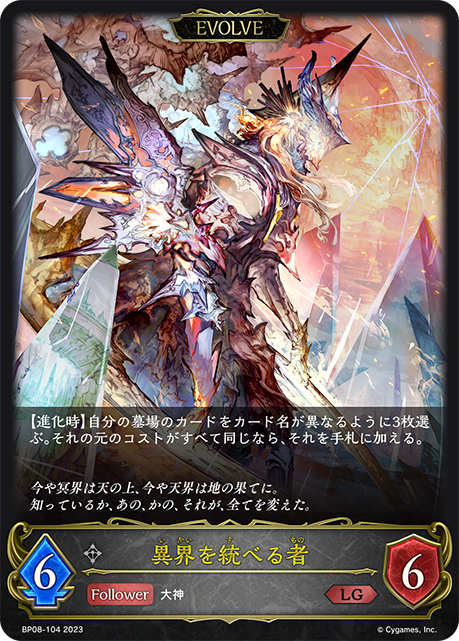 異界を統べる者 クラス ニュートラル カード種類 フォロワー・エボルヴ タイプ 大神 レアリティ LG 収録商品 ブースターパック第8弾「次元混沌」 コスト-攻撃力6体力6 【進化時】自分の墓場のカードをカード名が異なるように3枚選ぶ。それの元のコストがすべて同じなら、それを手札に加える。 今や冥界は天の上、今や天界は地の果てに。知っているか、あの、かの、それが、全てを変えた。 BP08-104