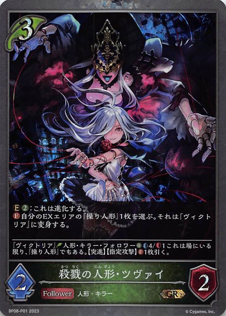 殺戮の人形・ツヴァイ クラス エルフ カード種類 フォロワー タイプ 人形・キラー レアリティ GR・プレミアム 収録商品 ブースターパック第8弾「次元混沌」 コスト3攻撃力2体力2 :これは進化する。自分のEXエリアの『操り人形』1枚を選ぶ。それは『ヴィクトリア』に変身する。―――――――――――――――『ヴィクトリア』人形・キラー・フォロワー4/1これは場にいる限り、『操り人形』でもある。【突進】【指定攻撃】1枚引く。 虹原BP08-P01
