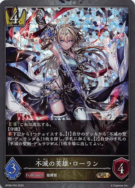 不滅の英雄・ローラン クラス ロイヤル カード種類 フォロワー タイプ 指揮官 レアリティ GR・プレミアム 収録商品 ブースターパック第8弾「次元混沌」 コスト4攻撃力3体力4 :これは進化する。【守護】下記から1つチョイスする。【1】自分のデッキから『不滅の聖剣・デュランダル』1枚を探し、手札に加える。【2】自分の手札の『不滅の聖剣・デュランダル』1枚を場に出してよい。 iruaBP08-P05