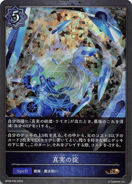 真実の掟 クラス ウィッチ カード種類 スペル タイプ 絶傑・魔法使い レアリティ GR・プレミアム 収録商品 ブースターパック第8弾「次元混沌」 コスト5攻撃力-体力- 自分の場に『真実の絶傑・ライオ』が出たとき、墓場のこれを消滅:自分のEPを+1する。-----------自分のデッキの上5枚を見る。その中から、元のコスト3以下のカード2枚までEXエリアに置いてよい。残りを好きな順にデッキの下に置く。このターン、それをプレイする際、コストを-3する。 萩オスBP08-P09