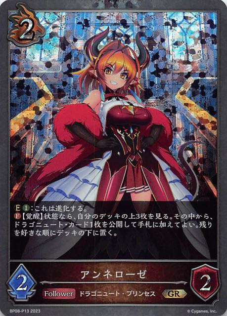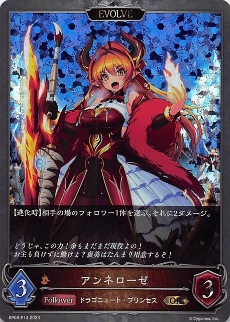 アンネローゼ クラス ドラゴン カード種類 フォロワー タイプ ドラゴニュート・プリンセス レアリティ GR・プレミアム 収録商品 ブースターパック第8弾「次元混沌」 コスト2攻撃力2体力2 :これは進化する。【覚醒】状態なら、自分のデッキの上3枚を見る。その中から、ドラゴニュート・カード1枚を公開して手札に加えてよい。残りを好きな順にデッキの下に置く。 BP08-P13