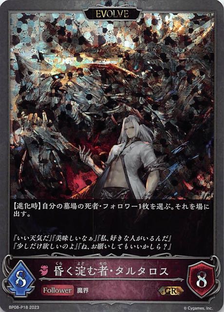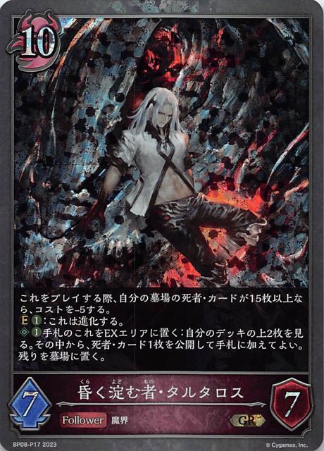 昏く淀む者・タルタロス クラス ナイトメア カード種類 フォロワー タイプ 魔界 レアリティ GR・プレミアム 収録商品 ブースターパック第8弾「次元混沌」 コスト10攻撃力7体力7 これをプレイする際、自分の墓場の死者・カードが15枚以上なら、コストを-5する。:これは進化する。手札のこれをEXエリアに置く:自分のデッキの上2枚を見る。その中から、死者・カード1枚を公開して手札に加えてよい。残りを墓場に置く。 N.ABP08-P17