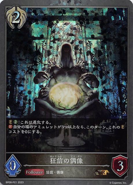 狂信の偶像 クラス ビショップ カード種類 フォロワー タイプ 狂信・偶像 レアリティ GR・プレミアム 収録商品 ブースターパック第8弾「次元混沌」 コスト2攻撃力0体力3 :これは進化する。自分の場のアミュレットが3つ以上なら、このターン、これのコストを0にする。 SEMSEIBP08-P21