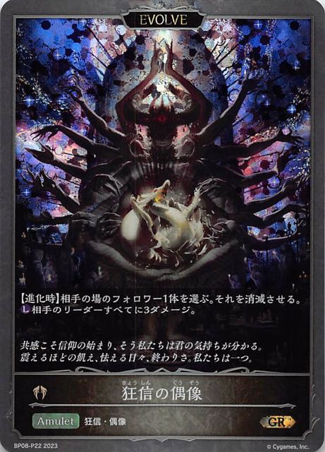 狂信の偶像 クラス ビショップ カード種類 アミュレット・エボルヴ タイプ 狂信・偶像 レアリティ GR・プレミアム 収録商品 ブースターパック第8弾「次元混沌」 コスト-攻撃力-体力- 【進化時】相手の場のフォロワー1体を選ぶ。それを消滅させる。相手のリーダーすべてに3ダメージ。 共感こそ信仰の始まり、そう私たちは君の気持ちが分かる。震えるほどの飢え、怯える日々、終わりさ。私たちは一つ。 SEMSEIBP08-P22