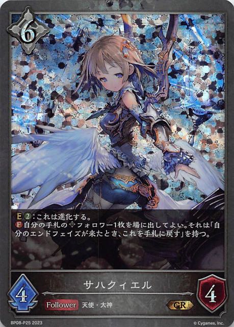 サハクィエル クラス ニュートラル カード種類 フォロワー タイプ 天使・大神 レアリティ GR・プレミアム 収録商品 ブースターパック第8弾「次元混沌」 コスト6攻撃力4体力4 :これは進化する。自分の手札のフォロワー1枚を場に出してよい。それは「自分のエンドフェイズが来たとき、これを手札に戻す」を持つ。 BP08-P25