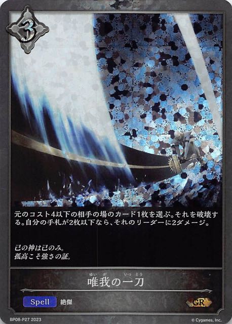 唯我の一刀 クラス ニュートラル カード種類 スペル タイプ 絶傑 レアリティ GR・プレミアム 収録商品 ブースターパック第8弾「次元混沌」 コスト3攻撃力-体力- 元のコスト4以下の相手の場のカード1枚を選ぶ。それを破壊する。自分の手札が2枚以下なら、それのリーダーに2ダメージ。 己の神は己のみ。孤高こそ強さの証。 宮﨑章BP08-P27