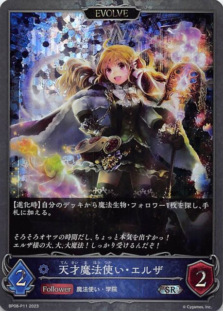 天才魔法使い・エルザ クラス ウィッチ カード種類 フォロワー・エボルヴ タイプ 魔法使い・学院 レアリティ SR・プレミアム 収録商品 ブースターパック第8弾「次元混沌」 コスト-攻撃力2体力2 【進化時】自分のデッキから魔法生物・フォロワー1枚を探し、手札に加える。 そろそろオヤツの時間だし、ちょっと本気を出すかっ!エルザ様の大、大、大魔法!しっかり受けるんだぞ! BP08-P11