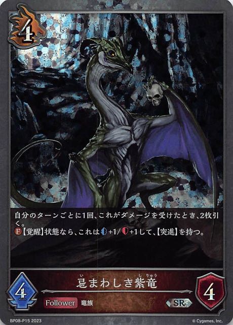 忌まわしき紫竜 クラス ドラゴン カード種類 フォロワー タイプ 竜族 レアリティ SR・プレミアム 収録商品 ブースターパック第8弾「次元混沌」 コスト4攻撃力4体力4 自分のターンごとに1回、これがダメージを受けたとき、2枚引く。【覚醒】状態なら、これは+1/+1して、【突進】を持つ。 米谷尚展BP08-P15
