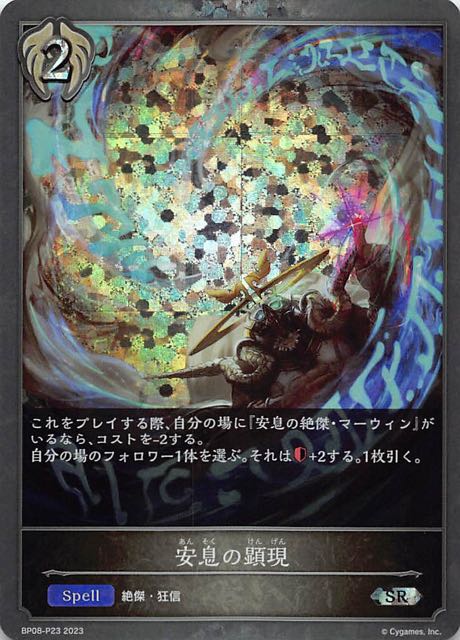 安息の顕現 クラス ビショップ カード種類 スペル タイプ 絶傑・狂信 レアリティ SR・プレミアム 収録商品 ブースターパック第8弾「次元混沌」 コスト2攻撃力-体力- これをプレイする際、自分の場に『安息の絶傑・マーウィン』がいるなら、コストを-2する。自分の場のフォロワー1体を選ぶ。それは+2する。1枚引く。 AOGIRIBP08-P23