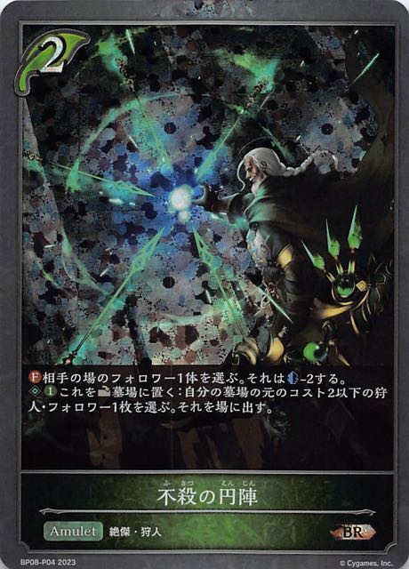 不殺の円陣 クラス エルフ カード種類 アミュレット タイプ 絶傑・狩人 レアリティ BR・プレミアム 収録商品 ブースターパック第8弾「次元混沌」 コスト2攻撃力-体力- 相手の場のフォロワー1体を選ぶ。それは-2する。これを墓場に置く:自分の墓場の元のコスト2以下の狩人・フォロワー1枚を選ぶ。それを場に出す。 萩オスBP08-P04