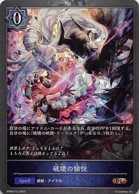 破壊の愉悦 クラス ウィッチ カード種類 スペル タイプ 絶傑・アイドル レアリティ BR・プレミアム 収録商品 ブースターパック第8弾「次元混沌」 コスト0攻撃力-体力- 自分の場にアイドル・カードがあるなら、自分のPPを1回復する。自分の場に『破壊の絶傑・リーシェナ』がいるなら、1枚引く。 世界とボク、どっちをとるの?もちろん答えは決まってるよね! 根岸千秋BP08-P12