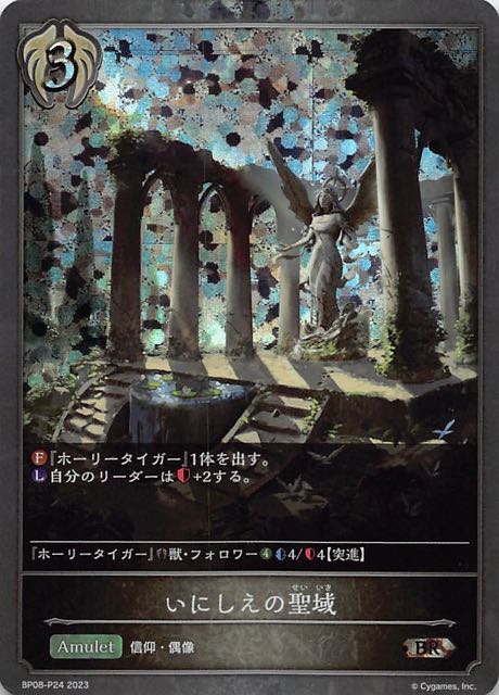 いにしえの聖域 クラス ビショップ カード種類 アミュレット タイプ 信仰・偶像 レアリティ BR・プレミアム 収録商品 ブースターパック第8弾「次元混沌」 コスト3攻撃力-体力- 『ホーリータイガー』1体を出す。自分のリーダーは+2する。―――――――――――――――『ホーリータイガー』獣・フォロワー4/4【突進】 SEMSEIBP08-P24
