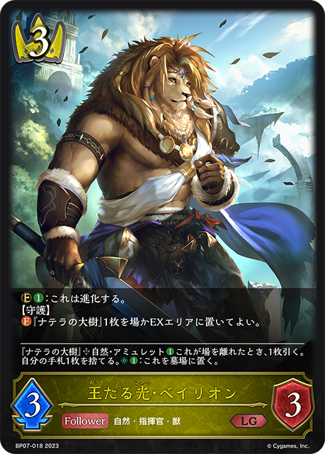 王たる光・ベイリオン クラス ロイヤル カード種類 フォロワー タイプ 自然・指揮官・獣 レアリティ LG 収録商品 ブースターパック第7弾「森羅鋼鉄」 コスト3攻撃力3体力3 :これは進化する。【守護】『ナテラの大樹』1枚を場かEXエリアに置いてよい。―――――――――――――――『ナテラの大樹』自然・アミュレットこれが場を離れたとき、1枚引く。自分の手札1枚を捨てる。:これを墓場に置く。 風篠BP07-018