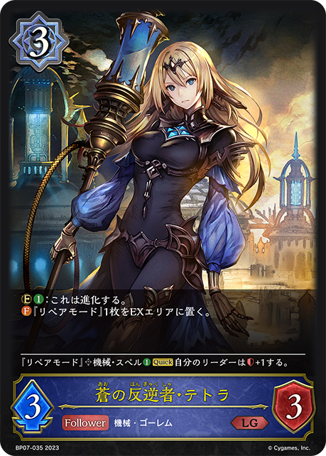 蒼の反逆者・テトラ クラス ウィッチ カード種類 フォロワー タイプ 機械・ゴーレム レアリティ LG 収録商品 ブースターパック第7弾「森羅鋼鉄」 コスト3攻撃力3体力3 :これは進化する。『リペアモード』1枚をEXエリアに置く。―――――――――――――――『リペアモード』機械・スペル自分のリーダーは+1する。 虹原BP07-035
