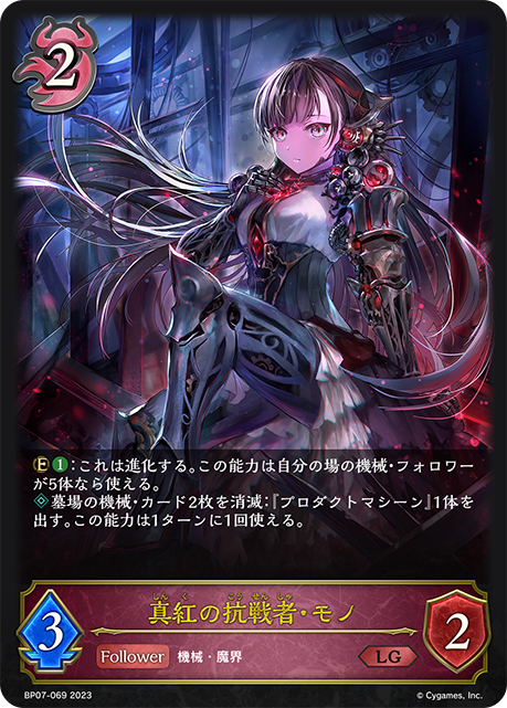 真紅の抗戦者・モノ クラス ナイトメア カード種類 フォロワー タイプ 機械・魔界 レアリティ LG 収録商品 ブースターパック第7弾「森羅鋼鉄」 コスト2攻撃力3体力2 :これは進化する。この能力は自分の場の機械・フォロワーが5体なら使える。墓場の機械・カード2枚を消滅:『プロダクトマシーン』1体を出す。この能力は1ターンに1回使える。 iruaBP07-069