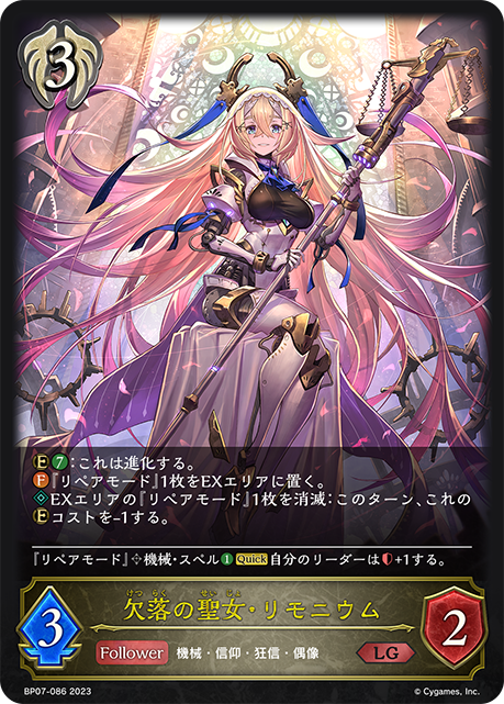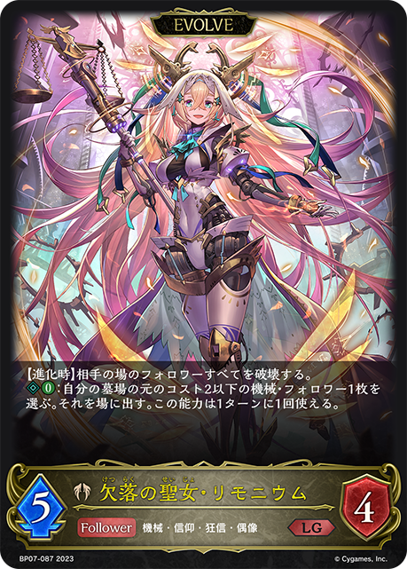 欠落の聖女・リモニウム クラス ビショップ カード種類 フォロワー・エボルヴ タイプ 機械・信仰・狂信・偶像 レアリティ LG 収録商品 ブースターパック第7弾「森羅鋼鉄」 コスト-攻撃力5体力4 【進化時】相手の場のフォロワーすべてを破壊する。:自分の墓場の元のコスト2以下の機械・フォロワー1枚を選ぶ。それを場に出す。この能力は1ターンに1回使える。 ナダレBP07-087