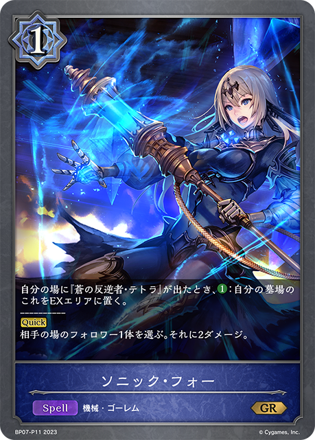 ソニック・フォー クラス ウィッチ カード種類 スペル タイプ 機械・ゴーレム レアリティ GR・プレミアム 収録商品 ブースターパック第7弾「森羅鋼鉄」 コスト1攻撃力-体力- 自分の場に『蒼の反逆者・テトラ』が出たとき、:自分の墓場のこれをEXエリアに置く。----------相手の場のフォロワー1体を選ぶ。それに2ダメージ。 虹原BP07-P11