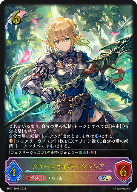クイーンセイバー・シンシア クラス エルフ カード種類 フォロワー タイプ エルフ族 レアリティ SL 収録商品 ブースターパック第7弾「森羅鋼鉄」 コスト6攻撃力4体力6 これがいる限り、自分の場の妖精・トークンすべては【疾走】【指定攻撃】を持つ。自分の場に妖精・トークンが出たとき、それは+2する。『フェアリーウィスプ』1枚をEXエリアに置く。自分の場の妖精・トークンすべては+2する。―――――――――――――――『フェアリーウィスプ』妖精・フォロワー1/1 ヘスンBP07-SL03