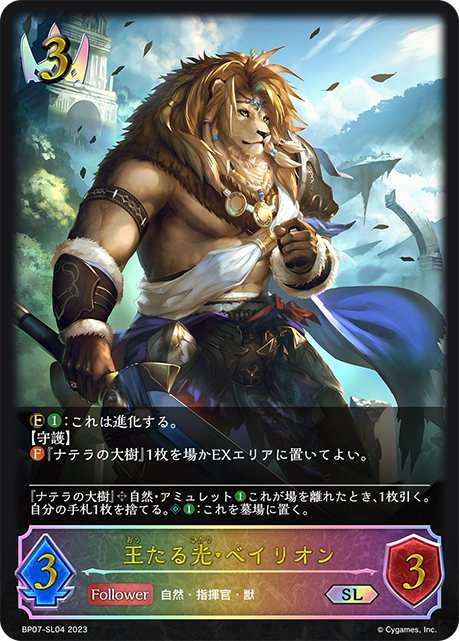 王たる光・ベイリオン クラス ロイヤル カード種類 フォロワー タイプ 自然・指揮官・獣 レアリティ SL 収録商品 ブースターパック第7弾「森羅鋼鉄」 コスト3攻撃力3体力3 :これは進化する。【守護】『ナテラの大樹』1枚を場かEXエリアに置いてよい。―――――――――――――――『ナテラの大樹』自然・アミュレットこれが場を離れたとき、1枚引く。自分の手札1枚を捨てる。:これを墓場に置く。 風篠BP07-SL04