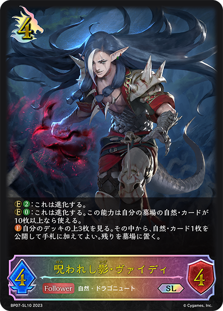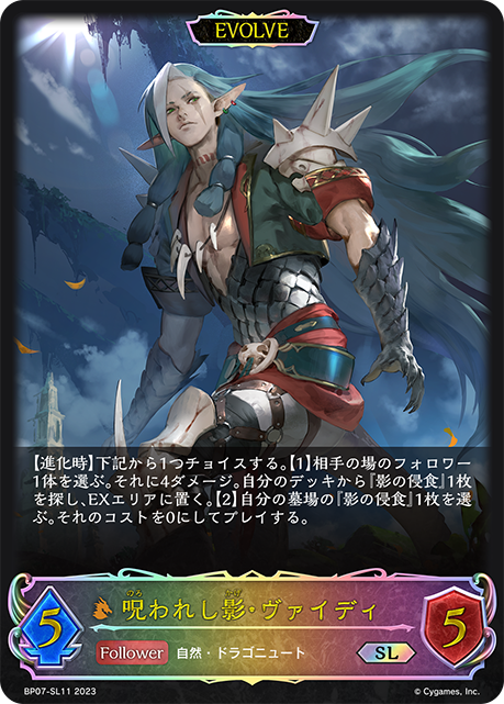 呪われし影・ヴァイディ クラス ドラゴン カード種類 フォロワー・エボルヴ タイプ 自然・ドラゴニュート レアリティ SL 収録商品 ブースターパック第7弾「森羅鋼鉄」 コスト-攻撃力5体力5 【進化時】下記から1つチョイスする。【1】相手の場のフォロワー1体を選ぶ。それに4ダメージ。自分のデッキから『影の侵食』1枚を探し、EXエリアに置く。【2】自分の墓場の『影の侵食』1枚を選ぶ。それのコストを0にしてプレイする。 南保あたるBP07-SL11