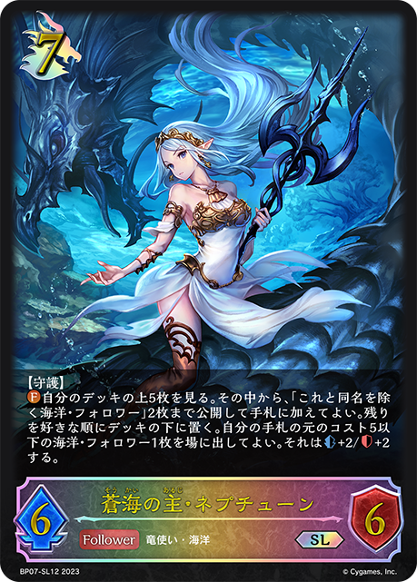 蒼海の主・ネプチューン クラス ドラゴン カード種類 フォロワー タイプ 竜使い・海洋 レアリティ SL 収録商品 ブースターパック第7弾「森羅鋼鉄」 コスト7攻撃力6体力6 【守護】自分のデッキの上5枚を見る。その中から、「これと同名を除く海洋・フォロワー」2枚まで公開して手札に加えてよい。残りを好きな順にデッキの下に置く。自分の手札の元のコスト5以下の海洋・フォロワー1枚を場に出してよい。それは+2/+2する。 虹原BP07-SL12