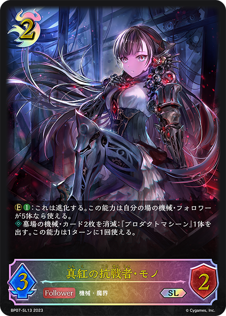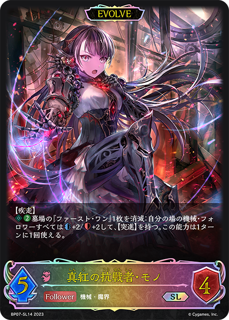 真紅の抗戦者・モノ クラス ナイトメア カード種類 フォロワー・エボルヴ タイプ 機械・魔界 レアリティ SL 収録商品 ブースターパック第7弾「森羅鋼鉄」 コスト-攻撃力5体力4 【疾走】墓場の『ファースト・ワン』1枚を消滅:自分の場の機械・フォロワーすべては+2/+2して、【突進】を持つ。この能力は1ターンに1回使える。 iruaBP07-SL14