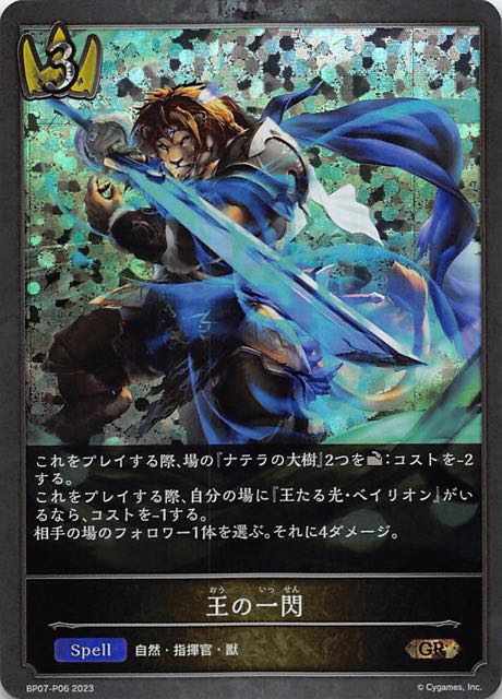 王の一閃 クラス ロイヤル カード種類 スペル タイプ 自然・指揮官・獣 レアリティ GR・プレミアム 収録商品 ブースターパック第7弾「森羅鋼鉄」 コスト3攻撃力-体力- これをプレイする際、場の『ナテラの大樹』2つを:コストを-2する。これをプレイする際、自分の場に『王たる光・ベイリオン』がいるなら、コストを-1する。―――――――――――――――『ナテラの大樹』自然・アミュレットこれが場を離れたとき、1枚引く。自分の手札1枚を捨てる。:これを墓場に置く。相手の場のフォロワー1体を選ぶ。それに4ダメージ。 風篠BP07-P06