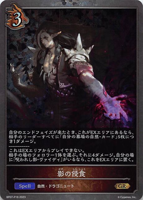 影の侵食 クラス ドラゴン カード種類 スペル タイプ 自然・ドラゴニュート レアリティ GR・プレミアム 収録商品 ブースターパック第7弾「森羅鋼鉄」 コスト3攻撃力-体力- 自分のエンドフェイズが来たとき、これがEXエリアにあるなら、相手のリーダーすべてに「自分の墓場の自然・カード」5枚につき1ダメージ。----------これはEXエリアからプレイできない。相手の場のフォロワー1体を選ぶ。それに4ダメージ。自分の場に『呪われし影・ヴァイディ』がいるなら、これをEXエリアに置く。 南保あたるBP07-P16