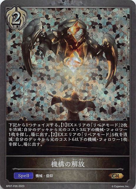 機構の解放 クラス ビショップ カード種類 スペル タイプ 機械・信仰 レアリティ GR・プレミアム 収録商品 ブースターパック第7弾「森羅鋼鉄」 コスト2攻撃力-体力- 下記から1つチョイスする。【1】EXエリアの『リペアモード』2枚を消滅:自分のデッキから元のコスト3以下の機械・フォロワー1枚を探し、場に出す。【2】EXエリアの『リペアモード』5枚を消滅:自分のデッキから元のコスト6以下の機械・フォロワー1枚を探し、場に出す。 オーベン道玄坂BP07-P26