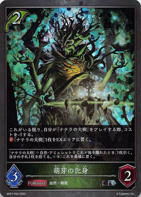 萌芽の化身 クラス エルフ カード種類 フォロワー タイプ 自然・精霊 レアリティ SR・プレミアム 収録商品 ブースターパック第7弾「森羅鋼鉄」 コスト2攻撃力3体力2 これがいる限り、自分が『ナテラの大樹』をプレイする際、コストを-1する。『ナテラの大樹』1枚をEXエリアに置く。―――――――――――――――『ナテラの大樹』自然・アミュレットこれが場を離れたとき、1枚引く。自分の手札1枚を捨てる。:これを墓場に置く。 BudiBP07-P04