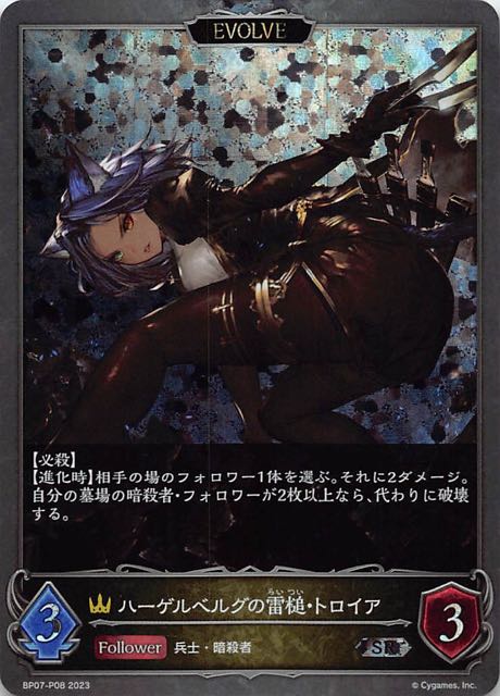 ハーゲルベルグの雷槌・トロイア クラス ロイヤル カード種類 フォロワー・エボルヴ タイプ 兵士・暗殺者 レアリティ SR・プレミアム 収録商品 ブースターパック第7弾「森羅鋼鉄」 コスト-攻撃力3体力3 【必殺】【進化時】相手の場のフォロワー1体を選ぶ。それに2ダメージ。自分の墓場の暗殺者・フォロワーが2枚以上なら、代わりに破壊する。 N.ABP07-P08